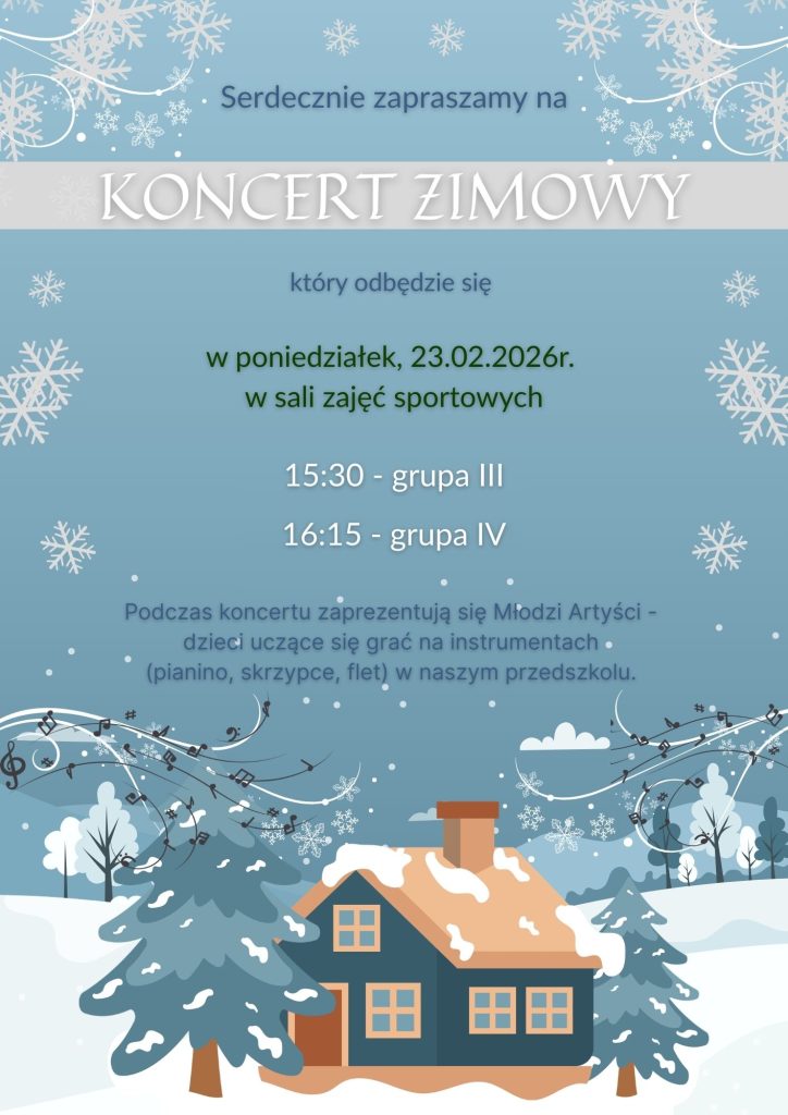 Serdecznie zapraszamy na „Koncert zimowy”, który odbędzie się w poniedziałek, 23.02.2026 r. w sali sportowej. Podczas koncertu zaprezentują się młodzi Artyści – dzieci uczące się grać na instrumentach (pianino, skrzypce, flet) w naszym przedszkolu.