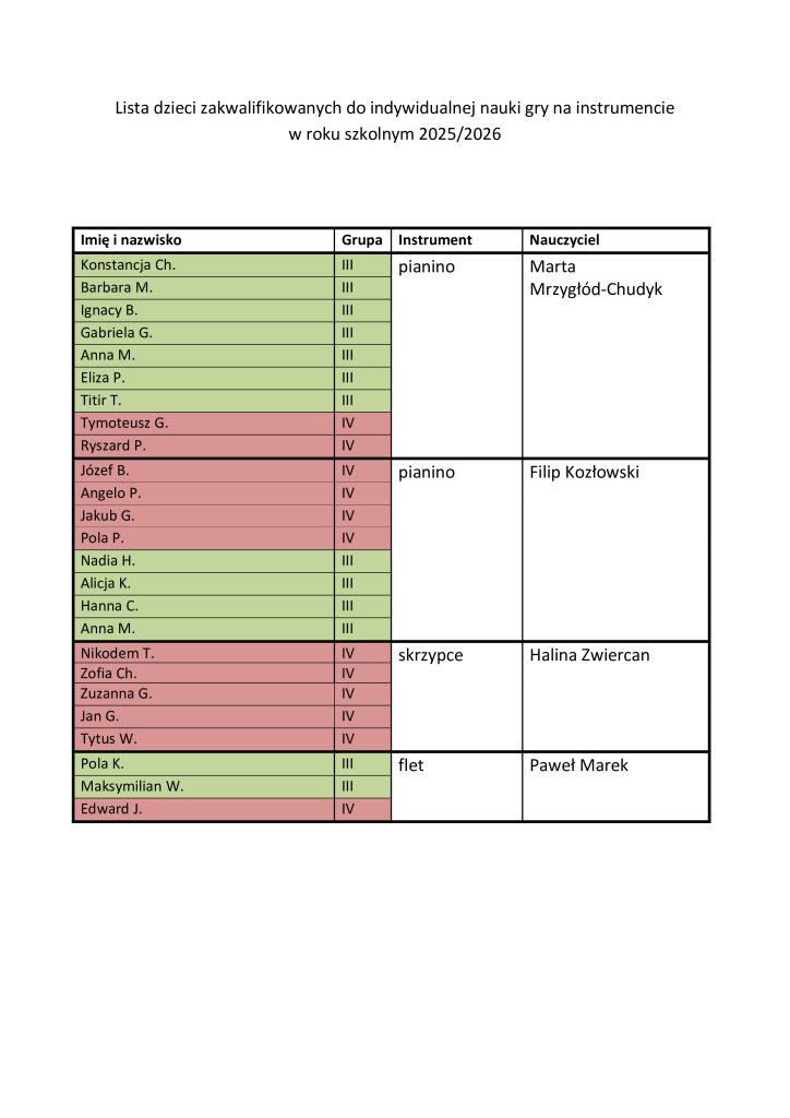 zakończyliśmy coroczne badania predyspozycji muzycznych dzieci 5 i 6-letnich, w wyniku których 25 naszych wychowanków zostało zakwalifikowanych do udziału w indywidualnych zajęciach nauki gry na instrumentach (skrzypce, pianino, flet). Listę dzieci znajdziecie Państwo w zakładce „działania muzyczne” oraz w holu przedszkola (z nazwiskami dzieci). W zakładce umieszczone są również szczegółowe zasady kwalifikacji dzieci do realizacji dodatkowych zajęć.